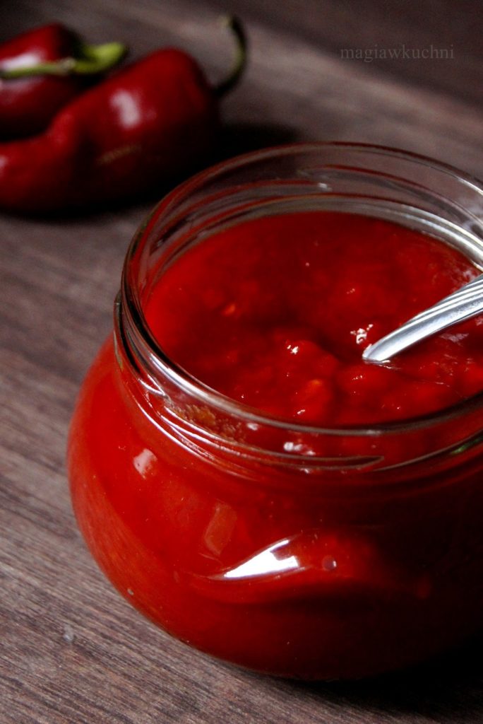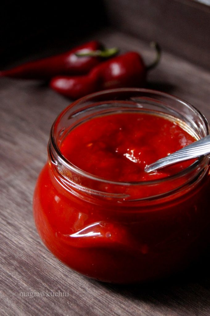 Lubicie ostre przyprawy, to proponuję ostry sos z chili – jest doskonałym dodatkiem do serów czy pieczonych mięs a nawet tak po prostu na kanapkę. Polecam