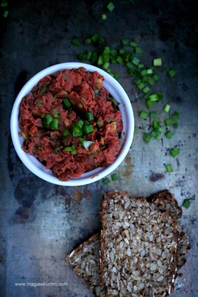 Wyrazista pasta z czerwonej fasoli przygotowana dosłownie w 5 minut jest lekko pikantna i pyszna idealna na szybkie zdrowe śniadanie. Jest bardzo aromatyczna przygotujcie ją a na pewno nie będziecie żałować 😉 Polecam