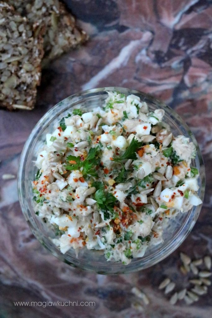 Makrelę obrać ze skóry i ości , jajka i szalotkę pokroić drobno w kostkę dodać do makreli. Słonecznik zalać gorącą wodą odstawić na 5 minut i odcedzić , dodać do makreli. Całość doprawić do smaku – wymieszać z majonezem i natką pietruszki . Podawać z ulubionym pieczywem .