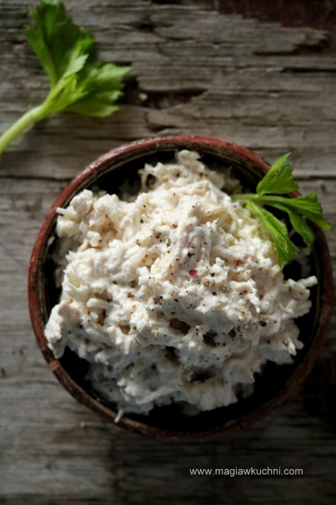 Pierś postrzępić na kawałki dodać odsączony seler , następnie wrzucić musztardę i majonez . Całość wymieszać i doprawić jeszcze solą i pieprzem , schłodzić w lodówce . Można podawać jako sałatkę lub jako pastę na kanapki .