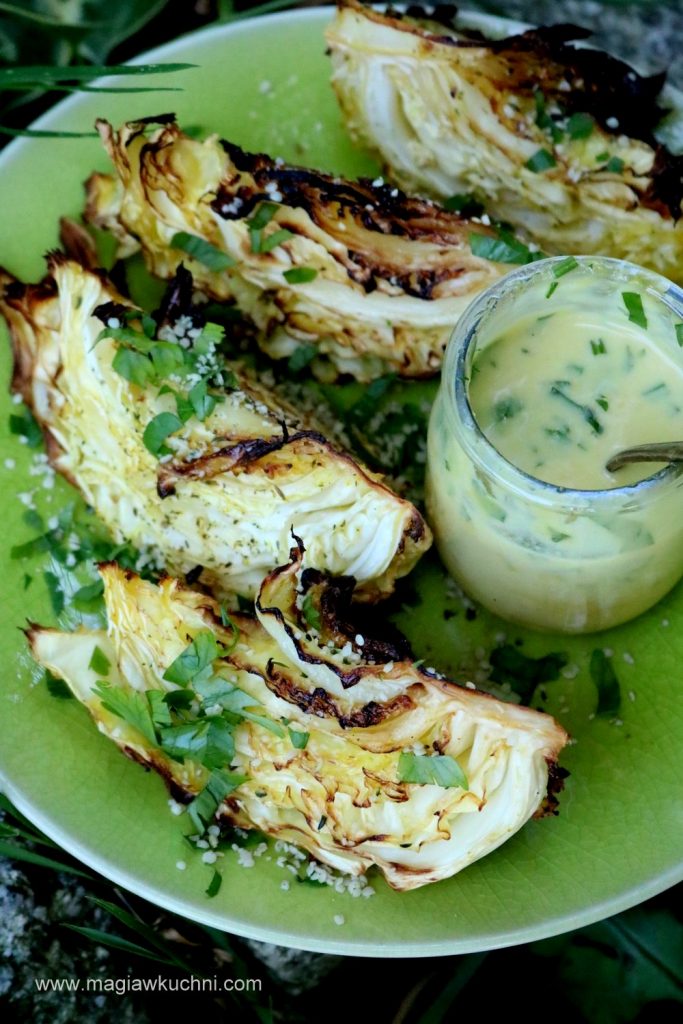Kapustę oczyścić z pierwszych liści następnie przekroić na pół i pokroić każdą połówkę jeszcze na pół lub na trzy części w zależności jak dużą mamy kapustę. Obrać czosnek i zetrzeć na drobnej tarce wymieszać go z solą i natrzeć kapustę , posypać przyprawami oraz oliwą. Następnie wyłożyć blachę do pieczenia papierem i układać kapustę. Wstawić do nagrzanego piekarnika 190 C i piec ok 15-20 minut aż się zrumieni i będzie miękka ( kapusta młoda piecze się szybko zaś starsza jeszcze raz tyle ) – pilnować aby się nie spaliła. Kiedy kapusta będzie się piekła przygotować sos .
