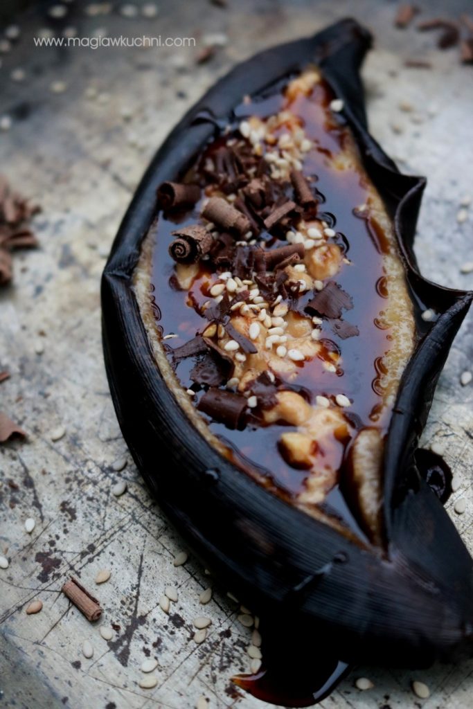 Nagrzej piekarnik do 180 C , wyłóż banany na blachę i piecz ok 10 minut aż będą na wpół miękkie a skóra zrobi się czarna, natnij je wzdłuż ale nie do końca do środka włóż masło orzechowe i piecz jeszcze pięć minut. Wyjąć banany na talerzyk polać syropem daktylowym i posypać sezamem oraz tartą gorzką czekoladą. Na końcu polać śmietanką kokosową dla przełamania słodyczy .