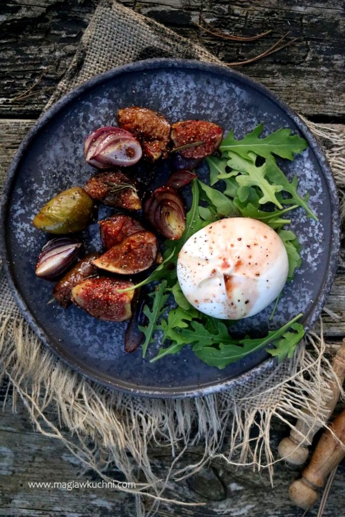 Owoce umyć i pokroić na ćwiartki przełożyć do naczynia, cebulę obrać i pokroić na ćwiartki jeżeli jest duża to na jeszcze mniejsze części. Wszystko posypać przyprawami i ziołami , delikatnie wymieszać wraz z oliwą i syropem daktylowym. Wstawić do nagrzanego piekarnika i piec ok 15 – 20 minut aż całość puści sok a cebula i figi staną się miękkie . Podawać z serem burrata lub hummusem posypane dodatkowym pieprzem .