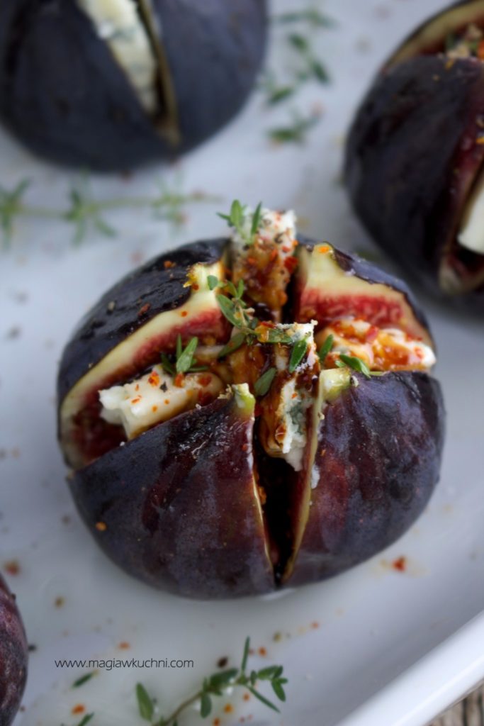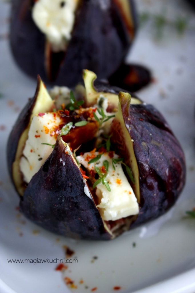 Figi umyć i osuszyć naciąć na X do 3/4 głębokości i lekko rozłożyć, posypać odrobiną płatków chilli. Następnie sery pokroić na małe kawałeczki i powciskać w figi , posypać listkami tymianku a na końcu polać słodkim octem balsamicznym (Jeżeli wolicie mniej ostre nie dodawać zbyt dużo płatków chilli). Owoce wyłożyć w naczyniu żaroodpornym i wstawić do nagrzanego piekarnika 180 C na ok 10 minut aż figi się rozłożą i przypieką, a ser się stopi .