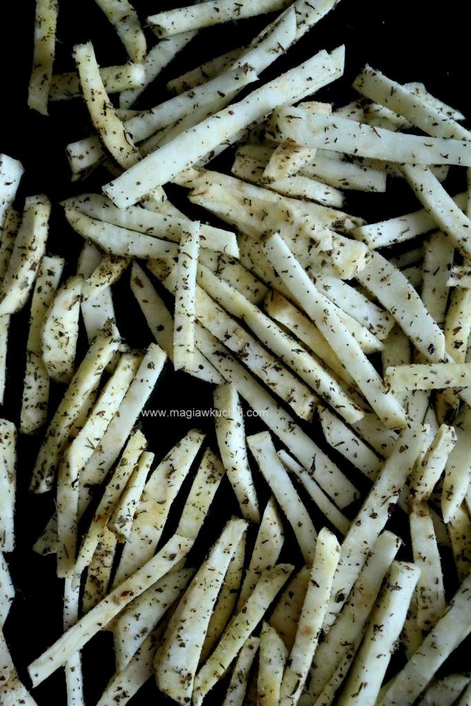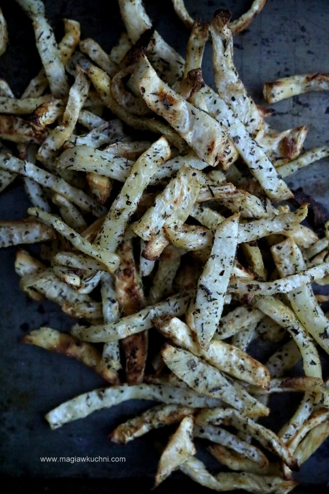 Pieczone frytki z selera i dip z ziołami