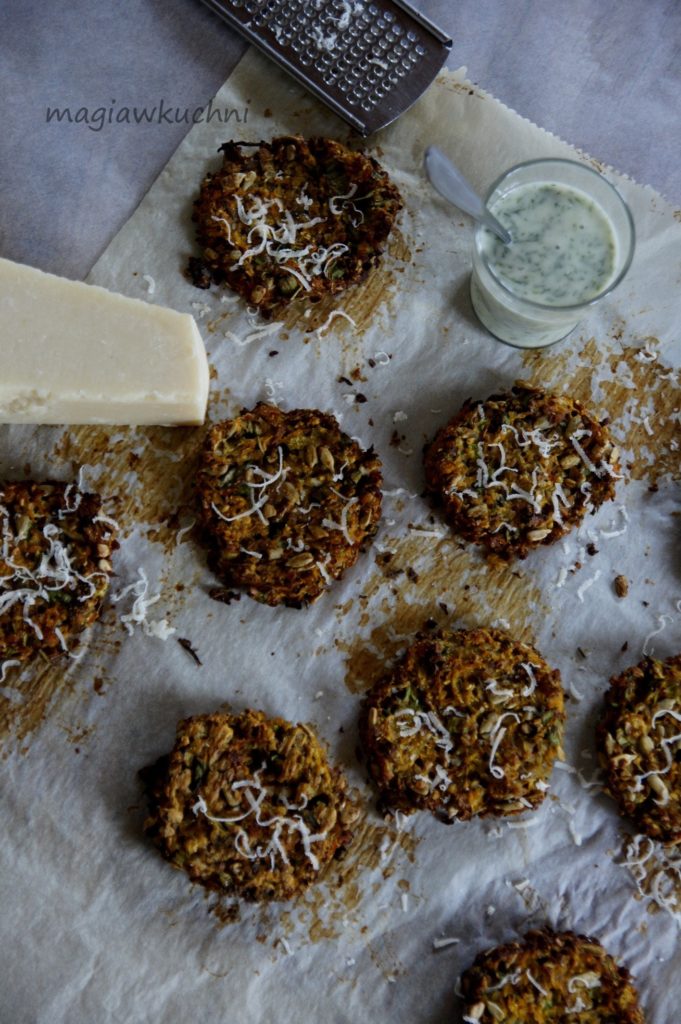 Blachę wyłożyć papierem do pieczenia nakładać po łyżce farszu i formować okrągłe placki łyżką. (na mojej blaszce mieści mi się dziewięć placków) Piekarnik nagrzać do 180 C i wstawić blachę z plackami piec ok 10 minut po tym czasie delikatnie odrywać od papieru najlepiej płaską łopatką – uważać aby się nie poparzyć odwrócić na drugą stronę i piec kolejne 10 minut do zrumienienia się. Podawać z sosem jogurtowym