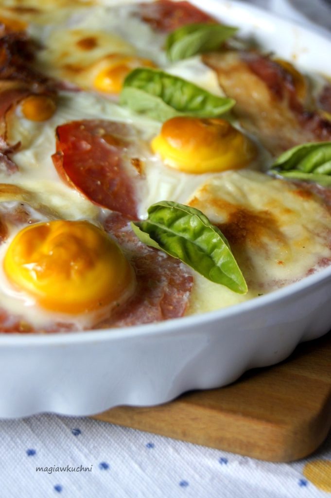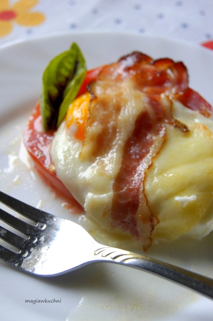 Formę wysmarować masłem , pomidory umyć i pokroić w plastry ok 1 cm. Na środku każdego pomidorka zrobić malutką dziurkę łyżeczką wykrawając jego część, następnie przyprawić solą i pieprzem ewentualnie ziołami. Na każdy plaster pomidor rozbijamy jedno jako, kroimy w plasterki mozzarelle i układamy każdy przy jajku. Na końcu kładziemy po plasterku boczku na żółtko lub z boku i wstawiamy do nagrzanego piekarnika 170 C na ok 10 minut do ścięcia się jajek i przyrumienienia się boczku.