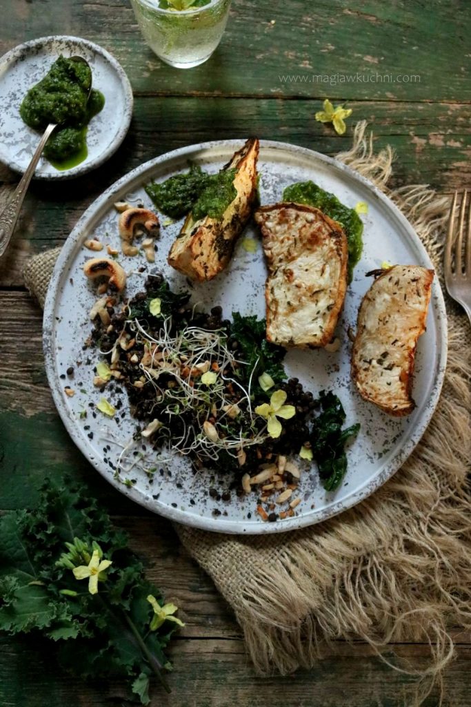 Jarmuż posolić, polać oliwą. Przesmażyć na patelni wraz z ugotowaną soczewicą i przełożyć na talerz. Posypać kiełkami oraz orzechami. Na tym samym talerzu układamy upieczony seler i polewamy dressingiem z czosnku niedźwiedziego.