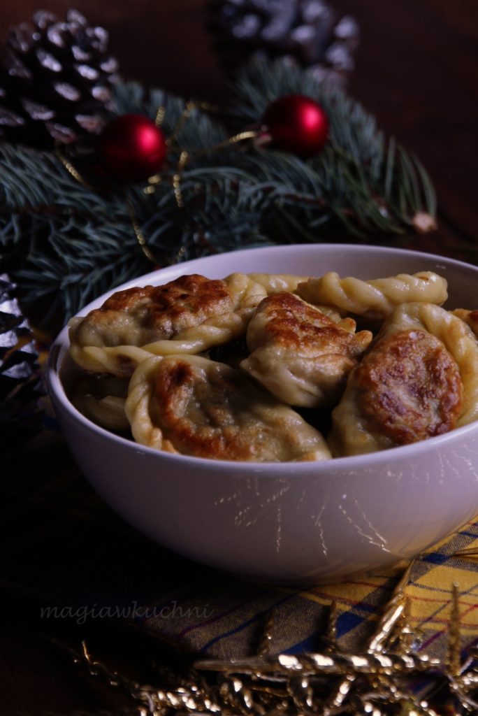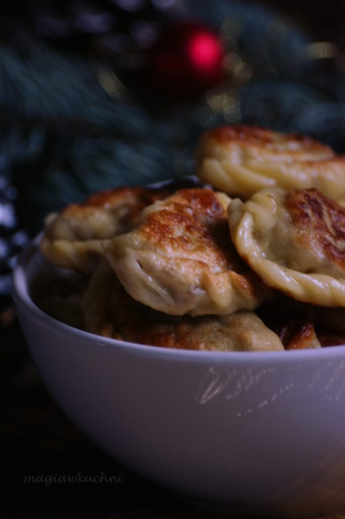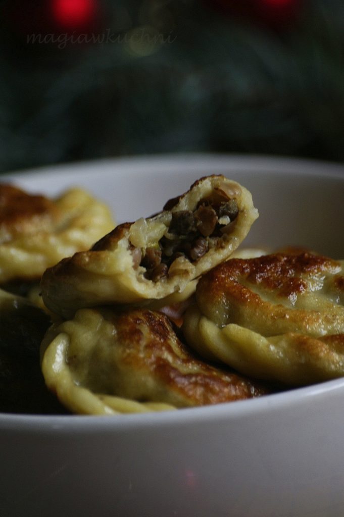 Pyszne pierogi z nadzieniem z kaszy gryczanej i aromatycznymi suszonymi grzybami w delikatnym cieście. Podsmażone na maśle klarowanym, polecam.