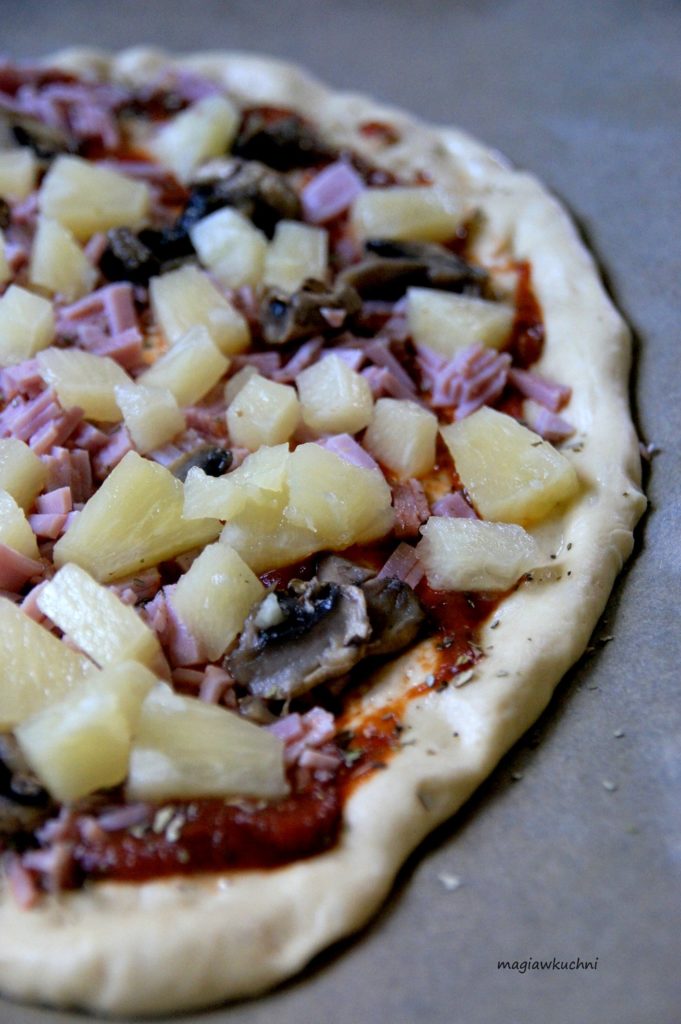 Po wyrośnięciu posmarować oliwą lub sosem pomidorowym i posypać oregano oraz wyłożyć usmażone pieczarki, odsączonego ananasa i szynkę – posypać serem Włożyć do nagrzanego piekarnika 180 C 20-30 minut jeżeli pieczemy z całego ciasta .