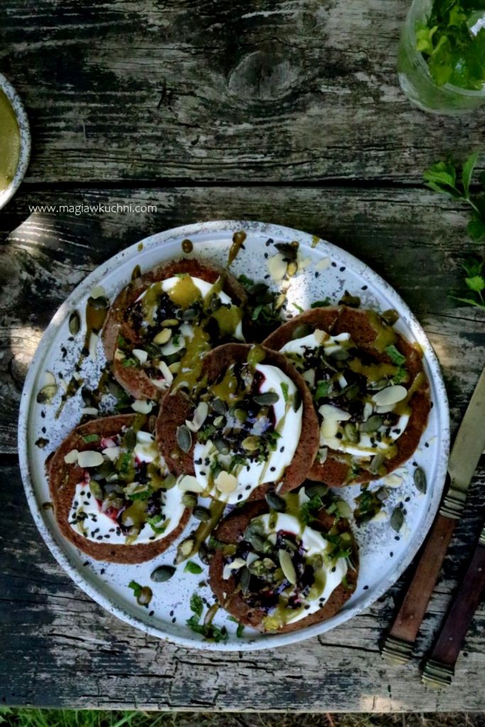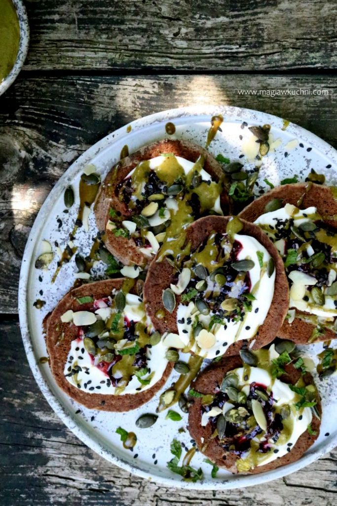 Ja podaję ze śmietaną kokosową, kwaśnymi powidłami śliwkowymi oraz masłem z pestek dyni i ulubionymi ziarnami.