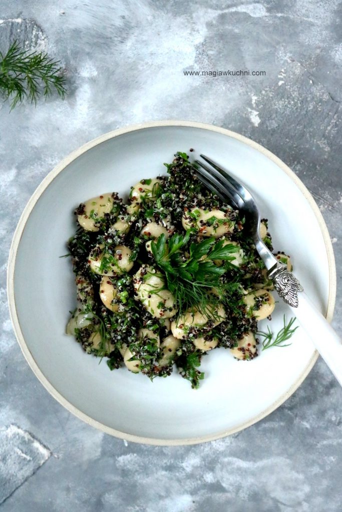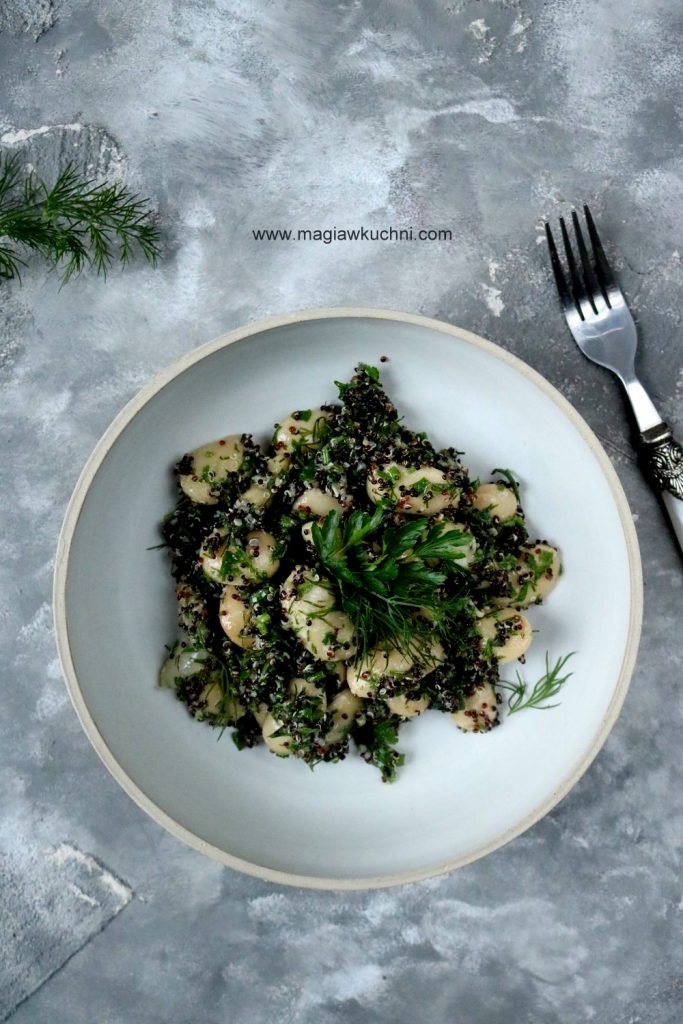 Kocham sałatki o czym z pewnością już się przekonaliście to moje ulubione danie które mogę jeść bez przerwy. Do tego ugotowana fasola jaś nadaje jej delikatności, zawiera zdrowe białko roślinne i jest bezglutenowa. A może masz ochotę zabrać ją do pracy na lunch , będzie również świetnym pomysłem,w lodówce przechowuj ją do dwóch dni a przed podaniem zawsze wymieszaj … polecam