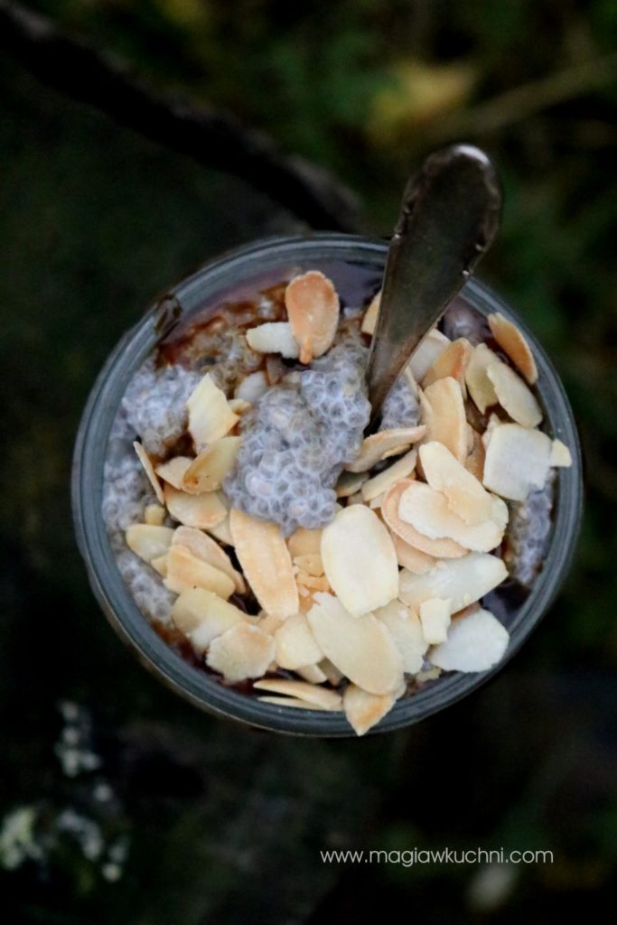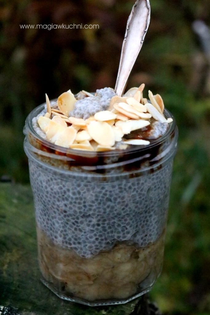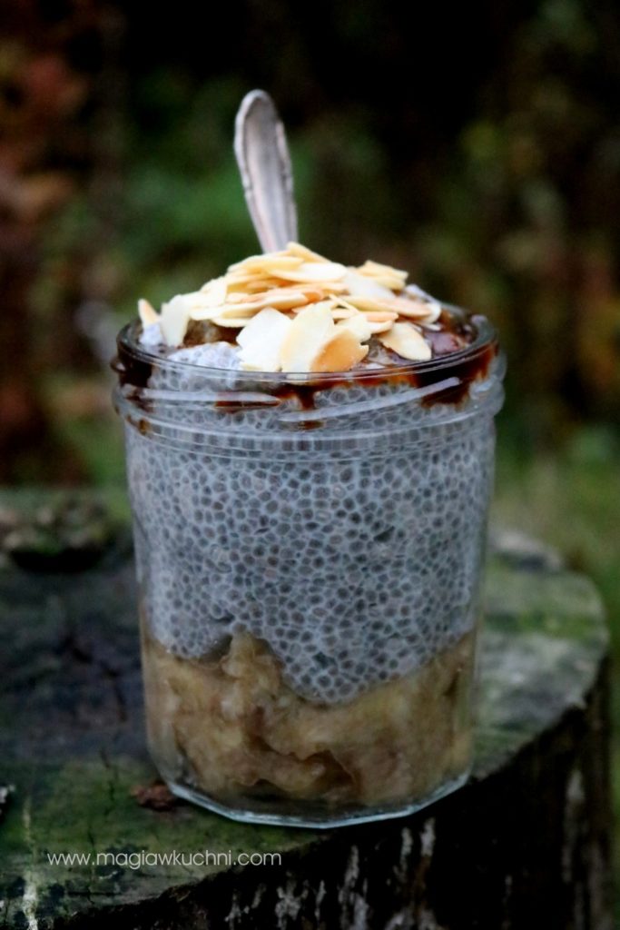 Przestudzone banany rozciąć i wyjąć ze środka upieczony owoc rozgnieść i rozłożyć do dwóch słoiczków na to przekładamy chia wymieszane w mleku, polewamy syropem daktylowym na końcu posypujemy uprażonymi płatkami migdałów.