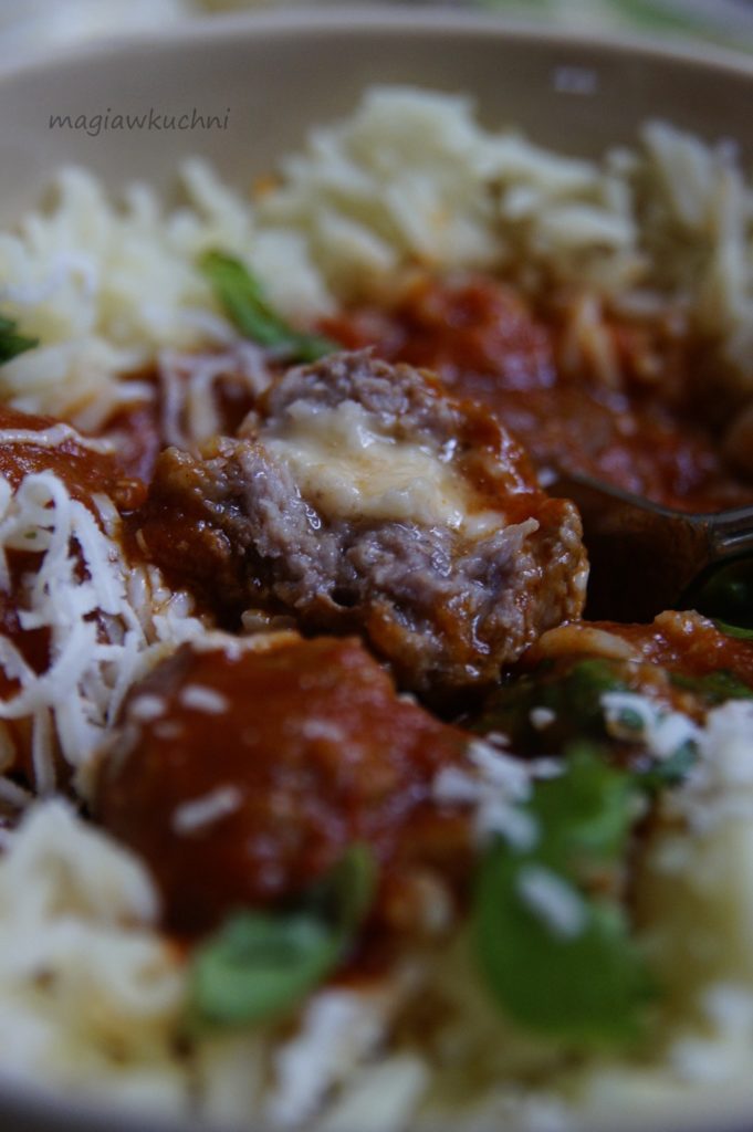 Pulpeciki w sosie pomidorowym z dodatkiem mozzarelli i pesto z suszonych pomidorów to lekkie i proste danie. Ja podaję je z ryżem basamati z odrobiną tartego sera domowej roboty lekko słonego i przypominającego konsystencją parmezan – choć nie kolorem. Polecam