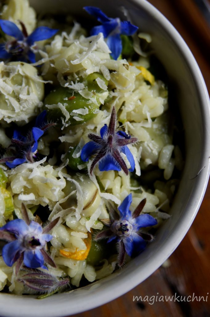 Na patelni rozgrzewam olej i wrzucam posiekaną cebulkę, podsmażam na rumiano następnie dodaję ryż i podsmażam aż stanie się przejrzysty, kolejno dodaję po chochelce gorącego bulionu oraz ugotowany wcześniej bób i obrany groszek. Następnie wino i dalej bulion- dodaję stopniowo aż ryż wchłonie cały płyn i stanie się miękki na koniec wsypać świeże zioła oraz kwiaty cukinii i ogórecznika mieszam i podaję posypany parmezanem. Risotto ewentualnie doprawić solą i pieprzem.