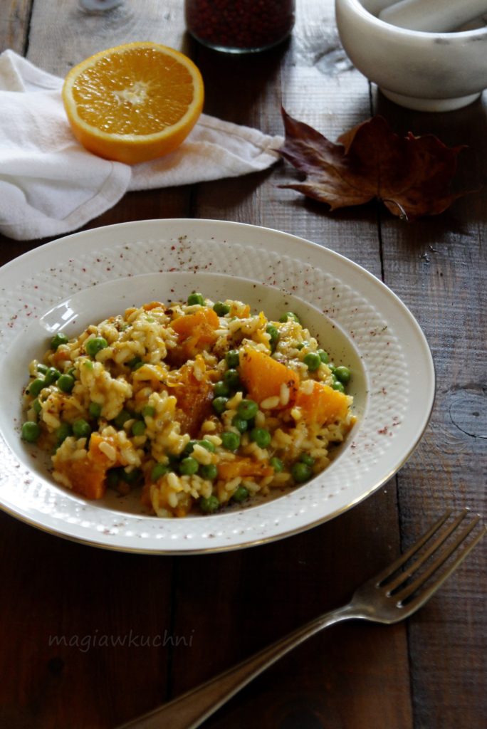 Na patelni rozgrzać oliwę dodać drobno pokrojone szalotki i zrumienić na patelni, wsypać ryż smażyć aż się zeszkli następnie zetrzeć skórkę z jednej pomarańczy i wycisnąć sok na razie z jednego owocu. Dodać półtwardą dynię i smażyć na małym ogniu – mieszając co jakiś czas. Gdy ryż wchłonie całą zawartość soku wlewać po jednej chochelce bulionu gdy wchłonie płyn dodać kolejną i tak powtarzać aż skończy się cały wywar. Pod koniec smażenia wrzucić kawałki sera oraz groszek i wlać wyciśnięty sok z drugiej pomarańczy doprawić jeszcze utartym czerwonym pieprzem ewentualnie solą i podawać na gorąco .