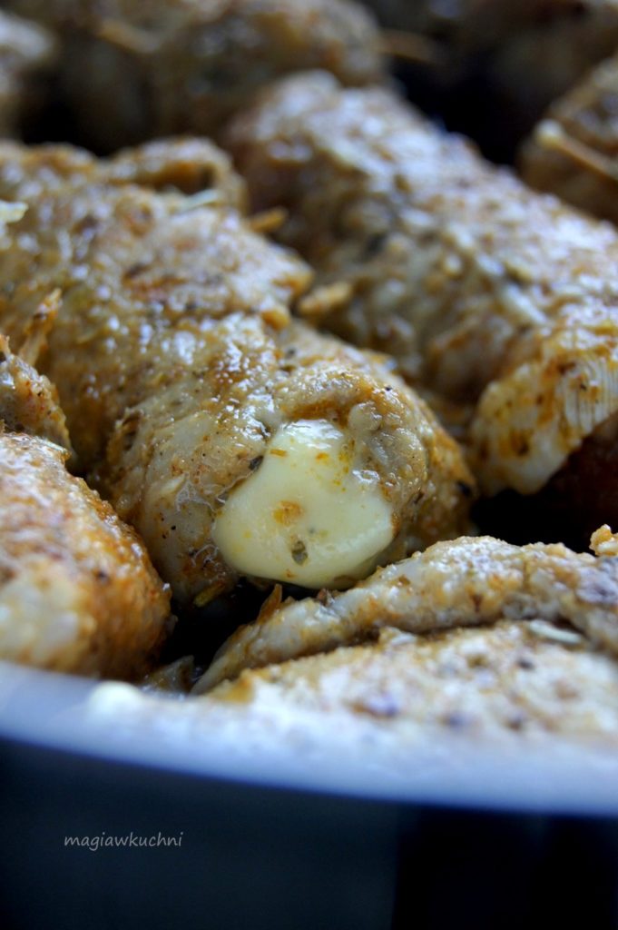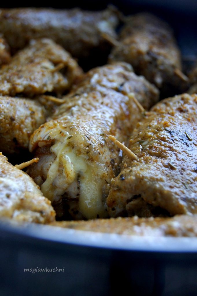 Mięso umyć, osuszyć i rozbić na większe kotlety – tak aby ich nie przedziurawić. Następnie obficie oprószyć przyprawa z obu stron, na każdy kawałek kładziemy po dwa plasterki sera – zwijamy ciasno i spinamy wykałaczkami. Usmażyć na maśle, gdy nabiorą złocistego koloru podlać niewielką ilością wody i dusić pod przykryciem ok 15 minut. U mnie podane z ziemniaczkami u karmel-itki z frytkami .