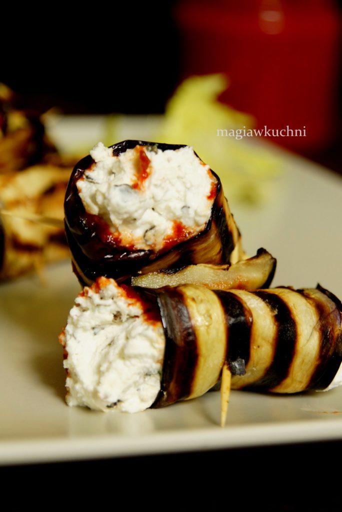 Roladki z bakłażana na ostro z pastą chili i ziołami oraz serem feta, można podawać jako przystawkę na imprezach. Polecam serdecznie