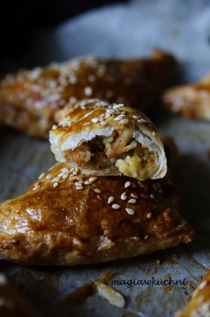 Kaszkę kuskus zalać gorącym wywarem lub wodą przykryć talerzykiem i pozostawić aż napęcznieje przełożyć do miski. Cebulę pokroić w kostkę i podsmażyć na patelni dodać do kaszki. Następnie dodajemy kawałki pokruszonego łososia i doprawiamy ostrą papką ewentualnie dodać soli i pieprzu. Całość wymieszać z jajkiem. Ciasto francuskie pokroić na kwadraty i nałożyć farsz sklejać na ukos – tworząc trójkąty. Przełożyć na blachę wyłożoną papierem do pieczenia posmarować białkiem i wstawić do nagrzanego piekarnika 180 C , piec ok 20 -25 minut do zrumienienia się.