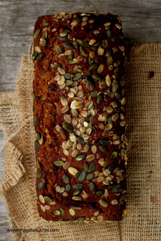 W dużej misce wymieszać mąkę , proszek do pieczenia , sodę , przyprawy oraz wiórki kokosowe. Wlać mokre składniki do suchych wymieszać do połączenia na końcu dodać jeszcze posiekane orzechy i rodzynki. Ciasto wlać do formy i obsypać pestkami dyni oraz płatkami owsianymi. Wstawić do nagrzanego piekarnika i piec ok 45 minut aż wykałaczka włożona do ciasta będzie czysta. Wystudzić w piekarniku przez minimum 15 minut potem można kroić i podawać z masłem – polecam.