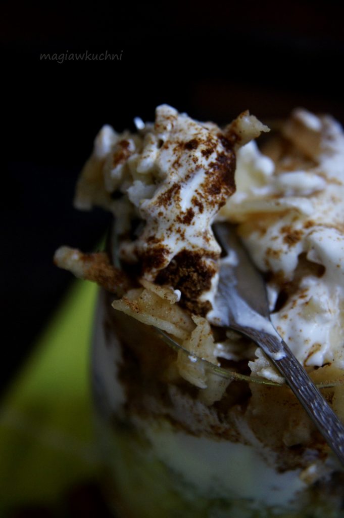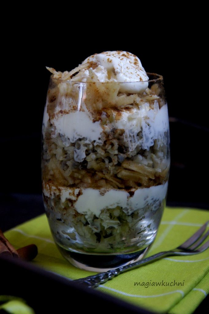 Jogurt wymieszać z miodem oraz sokiem z cytryny, jabłko umyć, obrać i zetrzeć na tarce jarzynowej. Na dno szklanki wsypać połowę ryżu na to jogurt i posypać cynamonem aż pokryje cały jogurt na to starte jabłko i znowu ryż, jogurt, jabłko, cynamon.