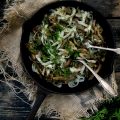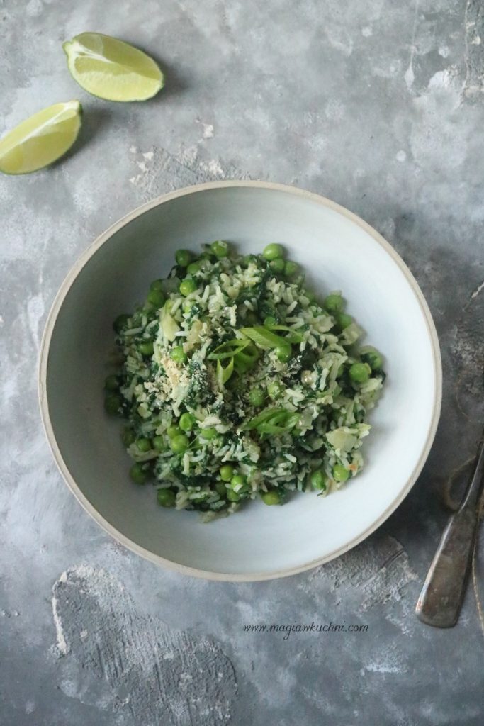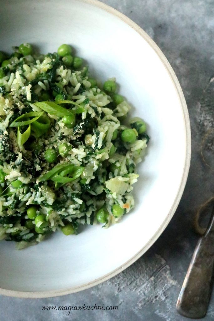 Na patelni rozgrzać tłuszcz wrzucić szpinak i dodać starty czosnek dodać sól i smażyć na małym ogniu aż szpinak zmniejszy swoją objętość. Teraz dodaj ryż oraz groszek i drobno pokrojona skórka z kiszonej cytryny dopraw solą do smaku i świeżo mielonym pieprzem . Przełożyć na talerze posypać czarnuszką można tez polać olejem lnianym oraz posypać zatarem i szczypiorkiem .
