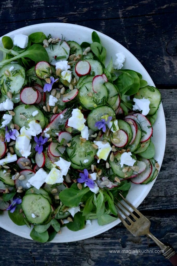 Wszystkie warzywa oczyścić,umyć i osuszyć. Na talerzu rozłóż roszponkę , do miski zetrzyj na tarce ogórki w plasterki tak samo zrób z rzodkiewką. Wrzuć posiekany koperek oraz rozkrusz fetę i polej dresingiem -wyłożyć na roszponkę. Teraz posyp podprażonym słonecznikiem , można też dodać jadalne kwiaty.