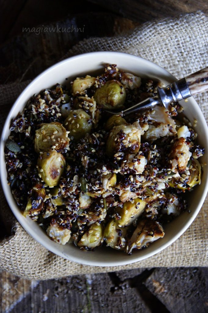 Kalafiora przekroić na pół jedną połówkę odłożyć drugą podzielić na mniejsze kawałki. Brukselki umyć , oczyścić z pierwszych liści i przekroić na pół. Blachę od piekarnik posmarować oliwą i wyłożyć kalafiora oraz brukselki – wstawić do nagrzanego piekarnika 200 C ok 15-20 minut aż się zrumieni. Wyjąć z piekarnika uważając aby się nie oparzyć – wystudzić.