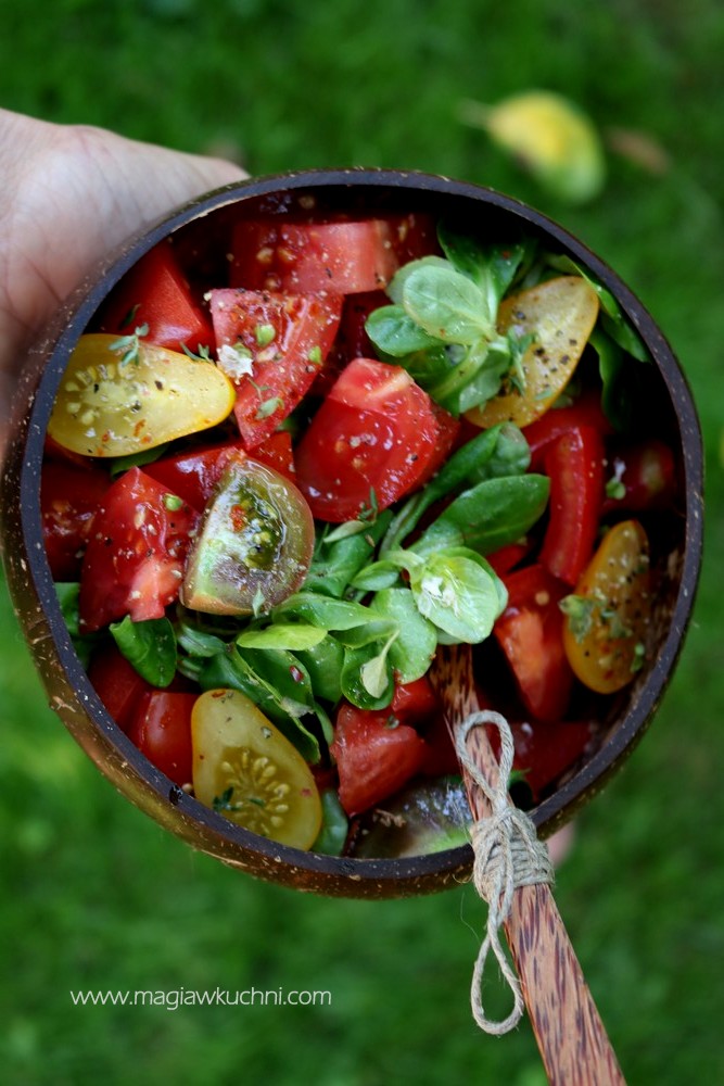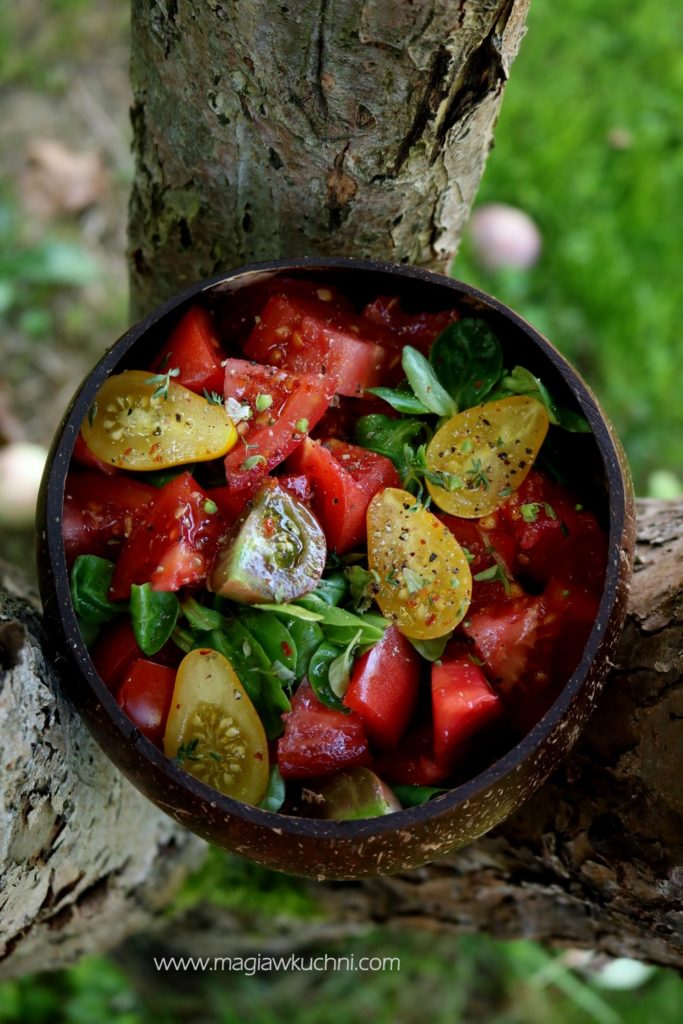 Pomidory pokroić mniejsze kawałki , wymieszać z roszponką ziołami i resztę przypraw – polać oliwą i podawać .