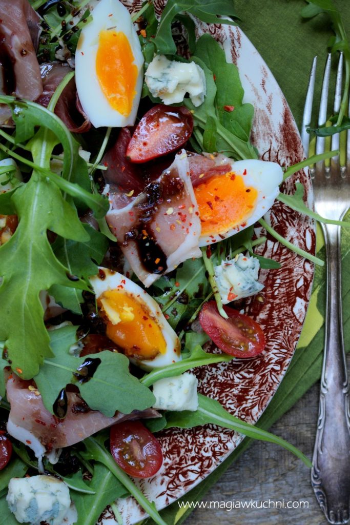 Rukolę umyć i osuszyć ułożyć na talerzu , na to układamy pokrojone na pół pomidorki następnie kawałki szynki oraz ugotowane jajko pocięte na ćwiartki . Ser porozrzucać po całości. teraz trzeba przygotować dresing do sałatki.