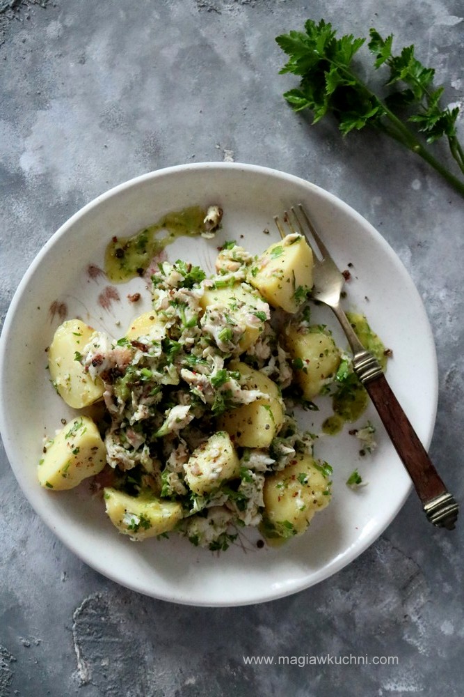 Ziemniaki umyć i ugotować w osolonej wodzie do miękkości. Rybę dokładnie obrać z ości i odstawić. Teraz przygotować dresing wymieszać wszystkie składniki i odstawić. Ugotowane ziemniaki odcedzić i wystudzić jeżeli jest taka potrzeba obrać ze skórki , pokroić na mniejsze kawałki dodać rybę i posiekaną natkę pietruszki polać dresingiem – wymieszać i podawać posypane świeżo mielonym pieprzem.