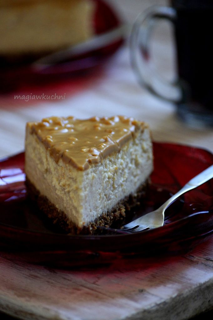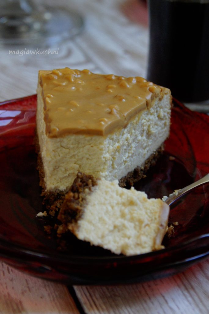 Na patelni podgrzać masło orzechowe i polać nim wierzch sernika – wystudzić i przełożyć do lodówki najlepiej na noc aby się porządnie schłodziło.