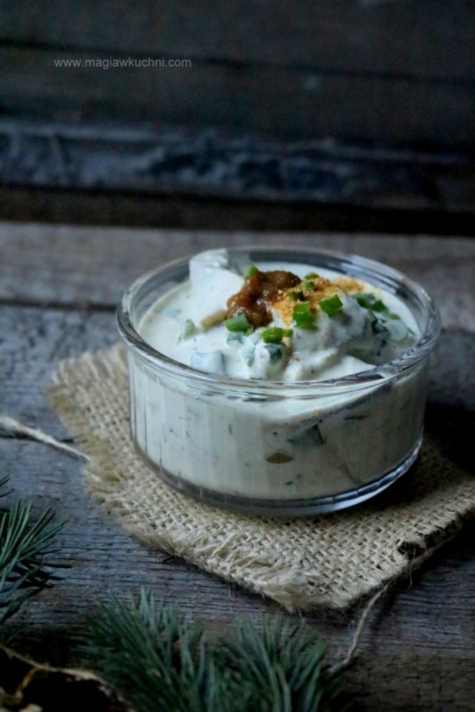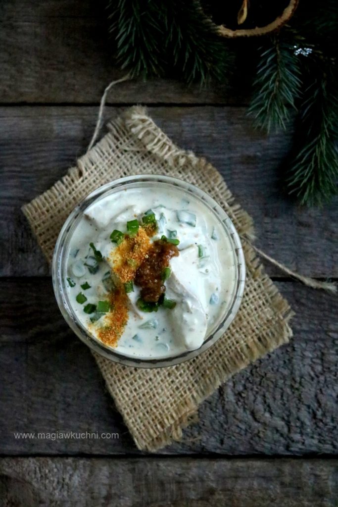 Teraz przygotować sos wymieszać wszystkie składniki dodać śledzie wcześniej pokrojone i szczypiorek – wymieszać , przełożyć całość do słoiczka i wstawić do lodówki . Najlepsze następnego dnia.