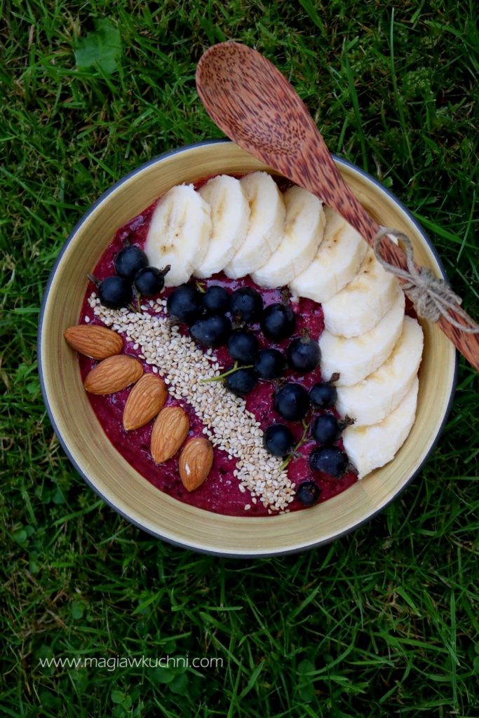 Smoothie bowl w kolorze fioletu to wspaniała porcja witamin 😉 dla mnie nie istnieje zła pora na owoce choć wiem że niektórzy wystrzegają się ich wieczorową porą… smoothie są zdrowe, sycące i uzależniające 😉 sprawdzą się zarówno na śniadanie,deser czy kolację polecam