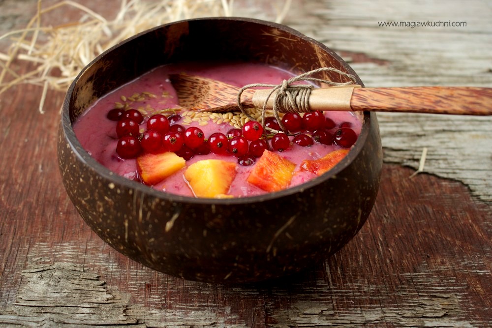 Wszystkie składniki wkładamy do blendera kielichowego i miksujemy na gładko jeżeli konsystencja jest zbyt gęsta dodajemy jeszcze mleka. Smoothie przelewamy dwóch miseczek, układamy kawałki brzoskwini, siemienia lnianego oraz gałązki czerwonej porzeczki.