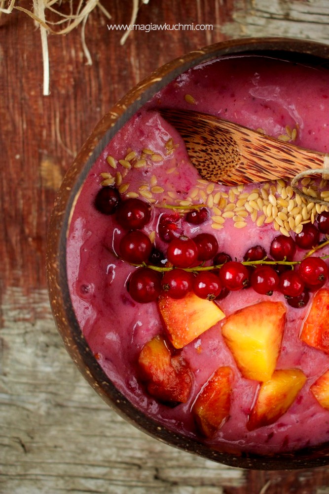 Smoothie bowl idealne na letnie śniadanie lub na przekąskę w ciągu dnia , dodaję siemię lniane dla dodatkowego białka i dużo owoców dla gęstej konsystencji 😉 olej kokosowy dla zdrowego tłuszczu można dodać zamiast oleju dowolne masło orzechowe. Polecam