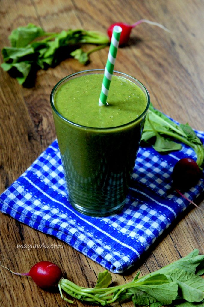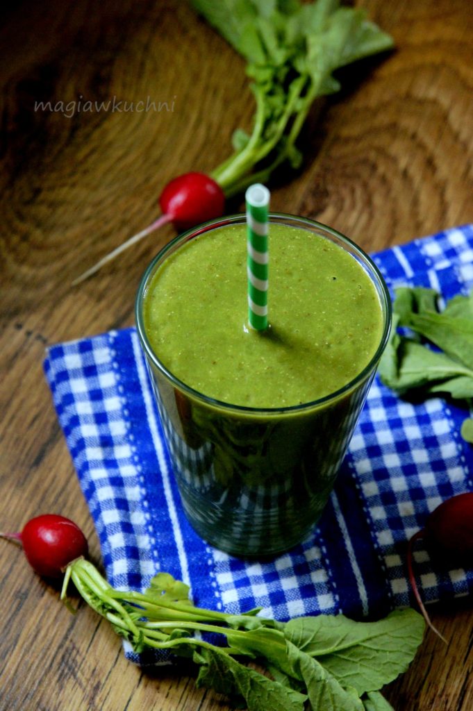 Liście rzodkiewki przełożyć do durszlaka i umyć , następnie przełożyć do blendera, dodać obrane banany , śliwki suszone oraz siemię lniane. Wszystko zmiksować z wodą lub mlekiem roślinnym oraz wyciśniętym sokiem z cytryny.