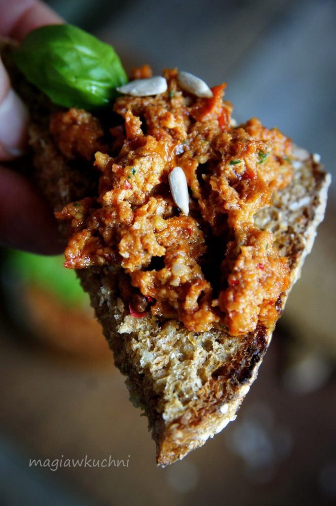 W ramach Wypiekania na śniadanie zrobiłam z innymi blogerami tą wspaniałą pastę od której można się uzależnić i to bez żartów. A może ja po prostu jestem uzależniona od warzywnych smarowideł kto wie ? 😉 .Jest odpowiednio przyprawiona, ja nie dodaję oliwek ponieważ za nimi szczególnie nie przepadam ale może kiedyś mi się to zmieni 😉 W końcu dużo produktów i potraw lubię których kiedyś bym nie przełknęła ha ha Ciekawe czy też tak macie.A pastę polecam 😉