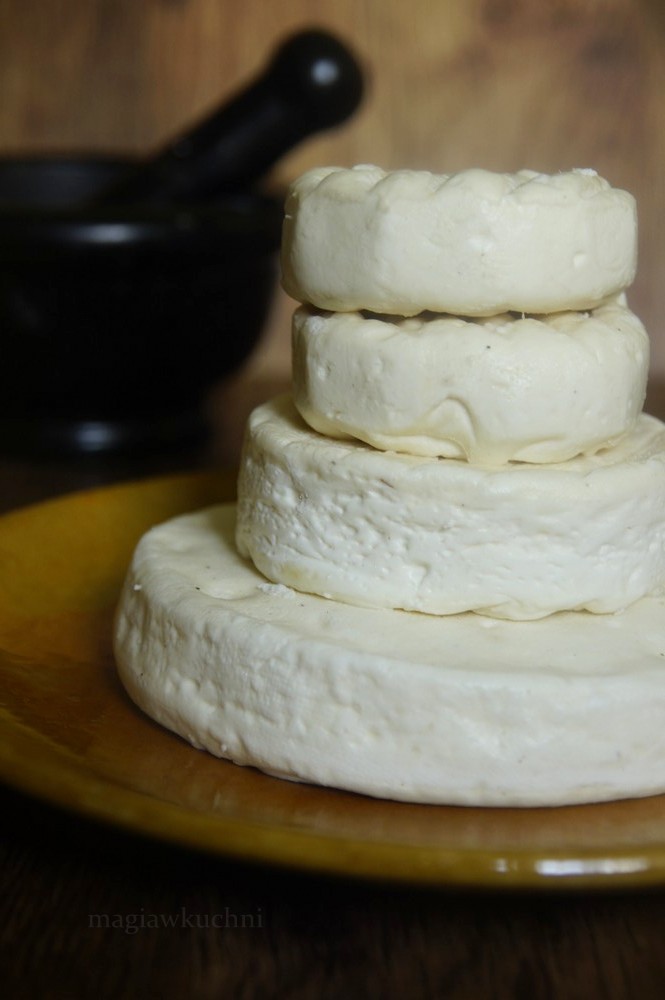 Do mleka dodać kwaśnego mleka, następnie mleko podgrzać do temperatury do 28 C i dodać rozpuszczona podpuszczkę w małej ilości wody. Odstawić aby mlek się ścięło, temperatura powinna wynosić w pomieszczeniu 20 C. Skrzep pokroić w kostkę ok 2 cm – odstawić na chwilę w tym czasie wydzieli się sporo serwatki. Następnie delikatnie przekładamy do stożkowatych form z dziurkami i stawiamy na kratce a pod nią formę do której będzie spływała serwatka. Skrzep zostawiam tak na ok 12 godzin po tym czasie zdejmuję formę, a ser odwracam i zostawiam jeszcze na ok 6 godzin. Po tym czasie ser nacieram solą ze wszystkich stron i zostawiam na kratce aby pozbawić go resztę serwatki – czynność tą powtarzam kolejnego dnia.