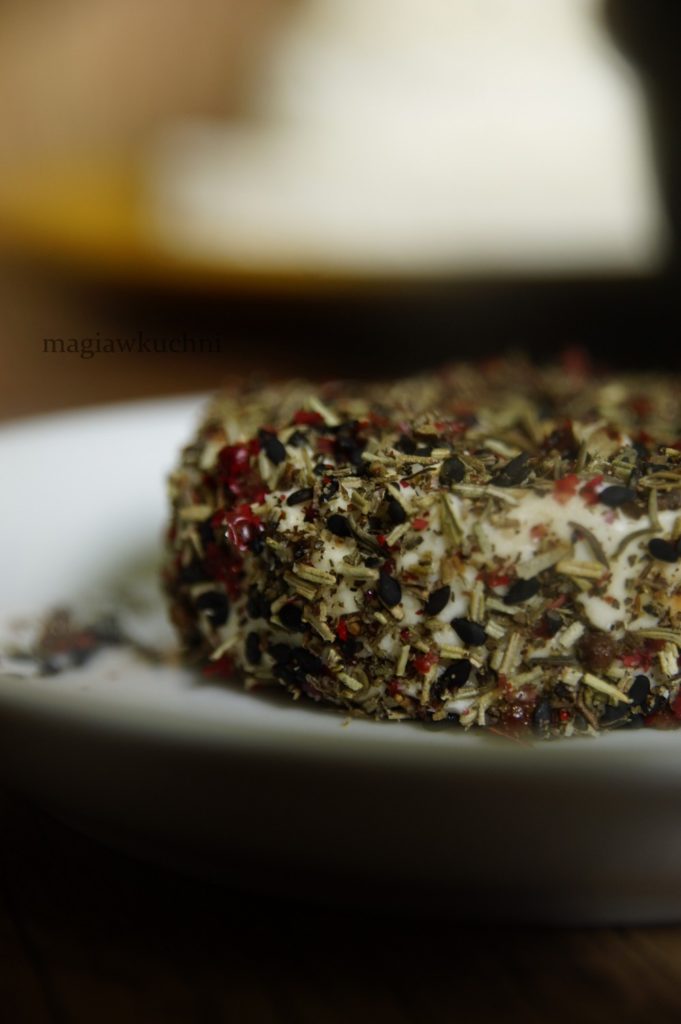Przyprawy utrzeć w moździerzu – obtoczyć serek przed podaniem.