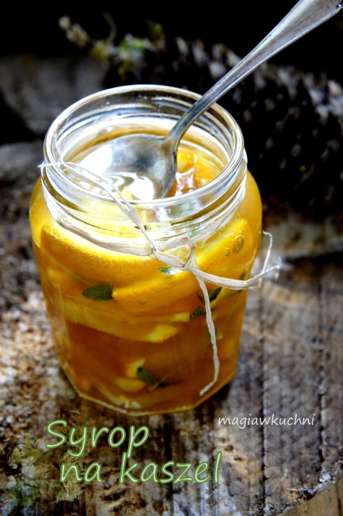 Słoik w którym będziemy przechowywać syrop wyparzyć go i wytrzeć do sucha. Owoc sparzyć i pokroić na mniejsze kawałki – przełożyć do słoiczka wraz z gałązką tymianku. Miód o tej porze ma już stałą konsystencję dlatego musimy go delikatnie podgrzać. Gdy zobaczymy że zaczyna powoli się roztapiać natychmiast ściągnąć z ognia. Jeszcze chwilę pomieszać aż cały będzie płynny i zalać owoce do 3/4 słoiczka . Odstawić na ok 3 godzinki aby owoce puściły sok. Polecam na ból gardła i kaszel.