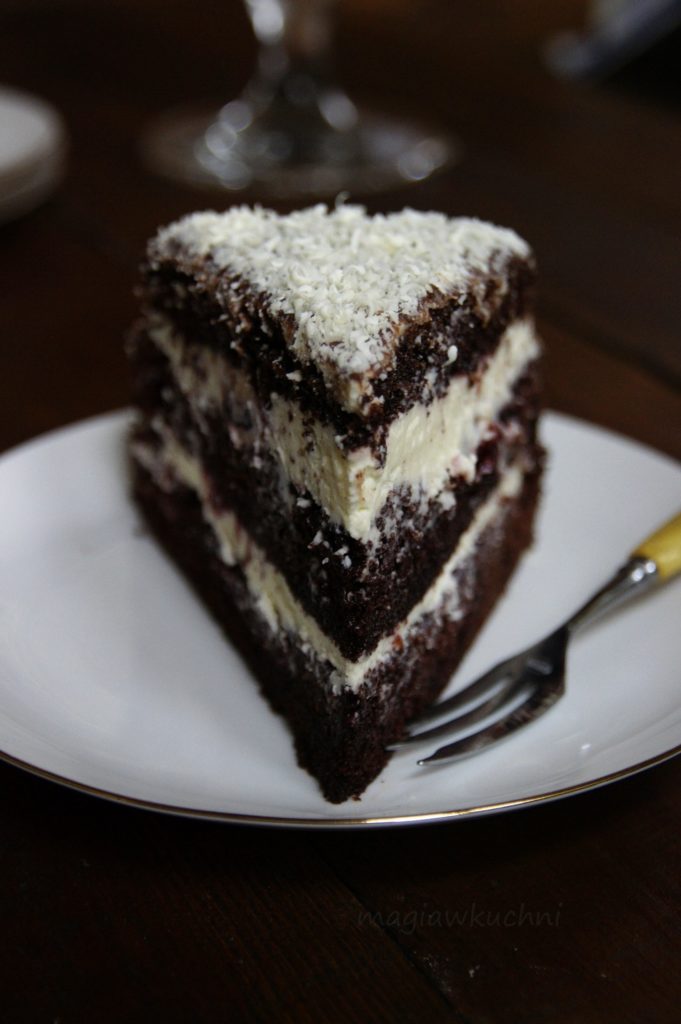 Tort potrójnie czekoladowy z kremowym kremem z białej czekolady wbrew pozorom nie jest zbyt słodki, smaki są wyważone i idealnie się ze sobą komponują. Jest wilgotny i mocno czekoladowy coś co lubię od czasu do czasu. Ciężko się mu oprzeć. Polecam dla smakoszy czekolady.