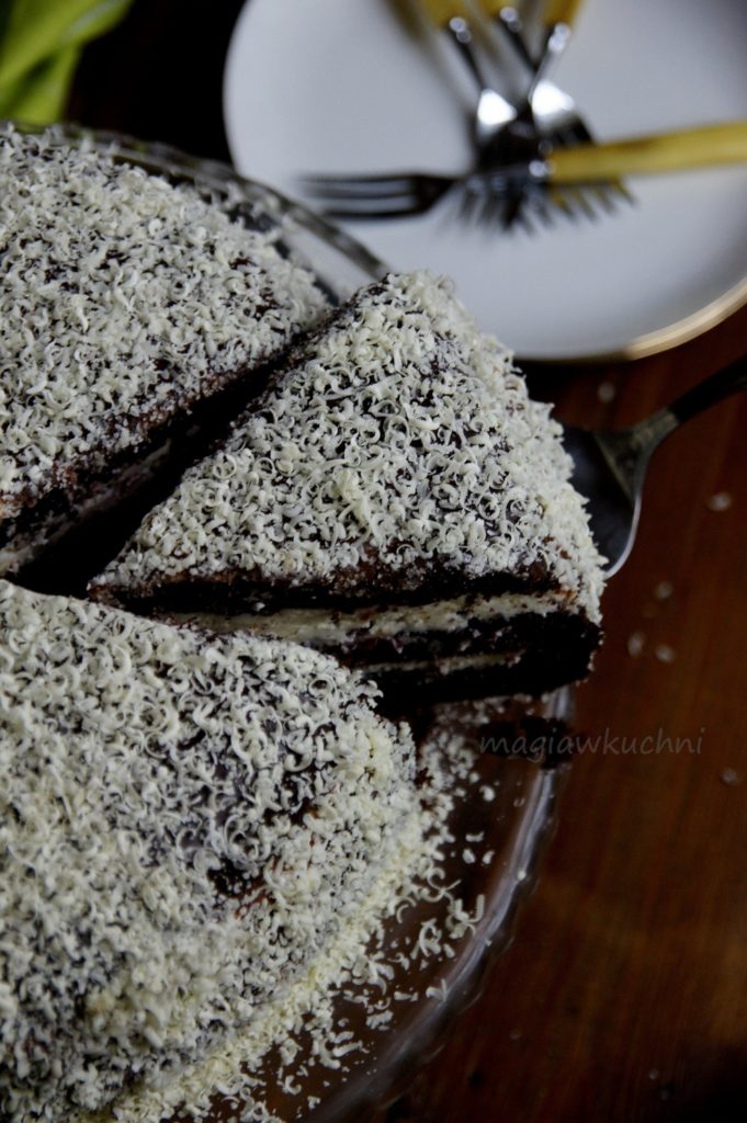 Białą czekoladę zetrzeć na tarce i obsypać boki oraz wierz tortu – wstawić na noc do lodówki.