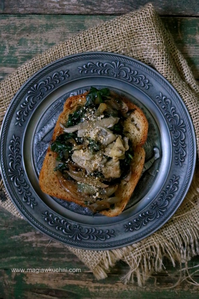Szybkie śniadanie se świeżym szpinakiem do tego aksamitne grzyby, młodziutkie i delikatne boczniaki 😉 Ostatnio brakuje mi czasu na gotowanie więc takie szybkie rozwiązania są idealne zwłaszcza że dużo pracy w ogrodzie , oczywiście nie narzekam bo bardzo lubię spędzać tam czas a tam ucieka szybciutko i niepostrzeżenie … lubię być połączona z naturą 😉 Do wykonania tego śniadania użyj najlepiej chleba wczorajszego grzanki wtedy są bardziej chrupiące to też sposób na jego odświeżenie. Jeżeli chcesz może wykonać nadzienie wieczorem a rano wystarczy tylko podgrzać i zrobić grzanki choć uważam że zrobione na świeżo smakują o wiele lepiej . Jeżeli nie jesteś weganką/ weganem możesz użyć masła klarowanego będzie jeszcze lepsze , polecam