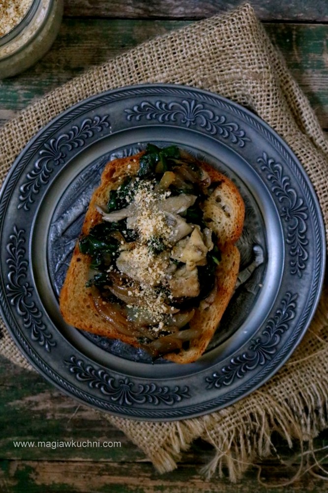 Gorące grzanki układamy na talerzach i wykładamy szpinakową masę na to grzybki i posypujemy wegańskim parmezanem .