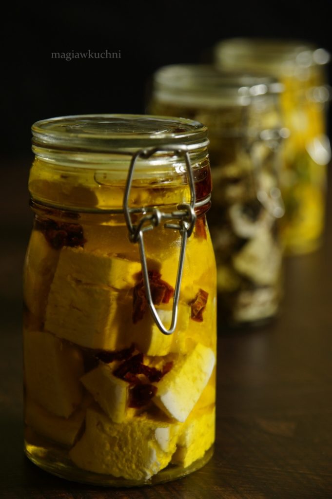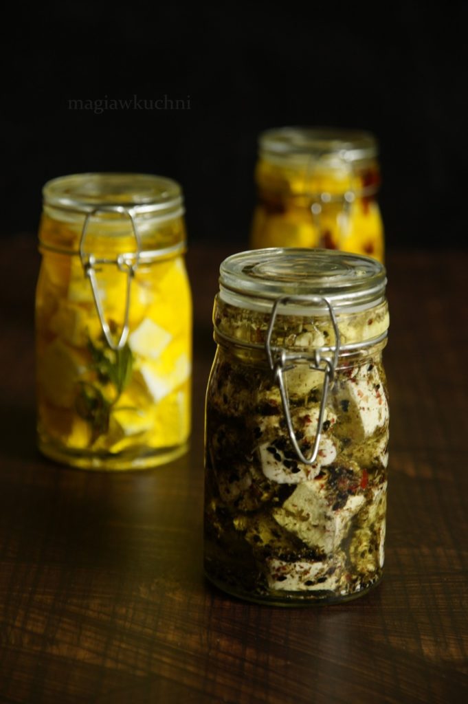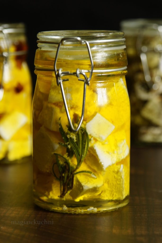 Serek pokroić w kostkę i przełożyć do słoiczka, olej wlać do garnuszka wrzucić kilka gałązek rozmarynu i podgrzać ale niezbyt mocno. Takim olejem zalać ser i zamknąć słoiczek.