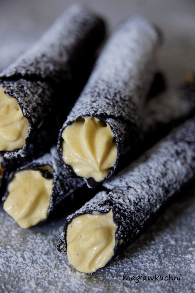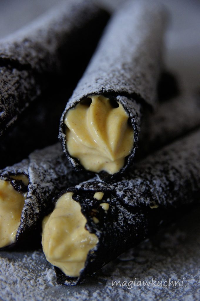 Nadzienie przełożyć do rękawa cukierniczego i nadziewać wcześniej przygotowane rurki waflowe. Podawać od-razu posypane cukrem pudrem.