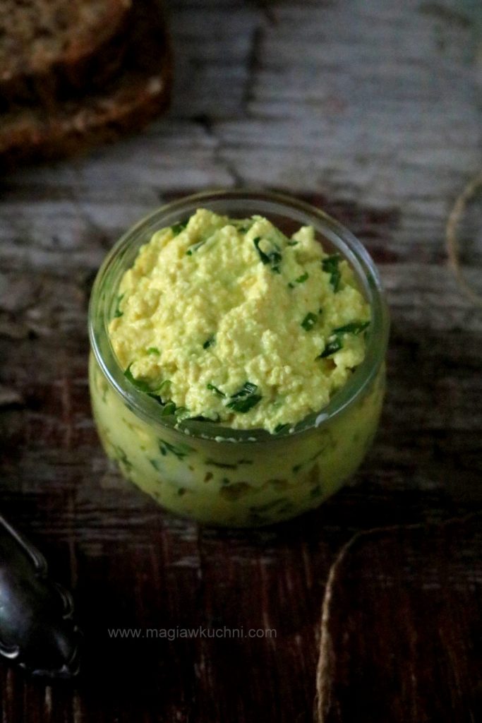 Majonez przełóż do małej miseczki i wymieszaj z kurkumą, syropem z agawy oraz czarną solą i świeżo mielonym pieprzem. Tofu wrzucić do blendera dodać majonez wymieszany z przyprawami i zmiksować całość na gładko. Na końcu wymieszać ze szczypiorkiem i płatkami drożdżowymi doprawić solą i pierzem do smaku. Przechowywać w lodowce .