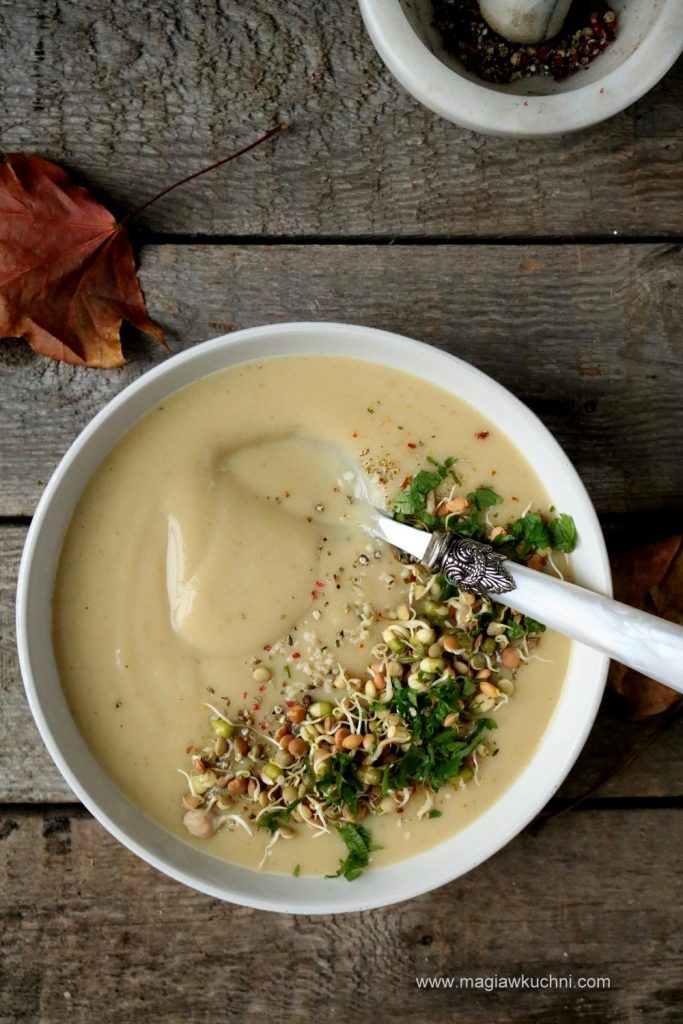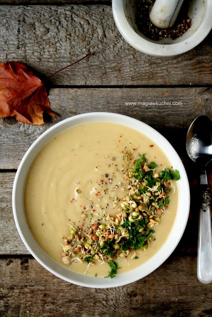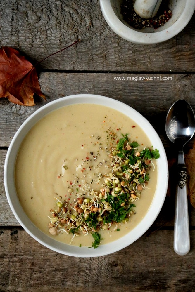 Bardzo aksamitna wegańska zupa ziemniaczana z dodatkiem kalafiora i wyraźnym smakiem cytryny oraz świeżych ziół . To idealny czas na jej przygotowanie w okresie jesienno zimowym potrzebujemy rozgrzewających potraw które rozgrzej nas od środka i nasyci na długi czas. Lubie dodawać do zup świeże zioła oraz kiełki które wzbogacą zupę o dodatkowe białko i witaminy. Polecam