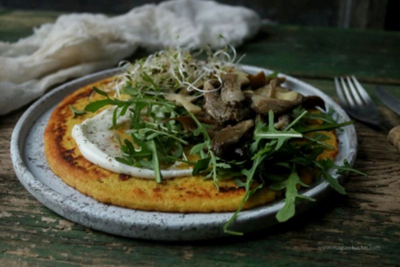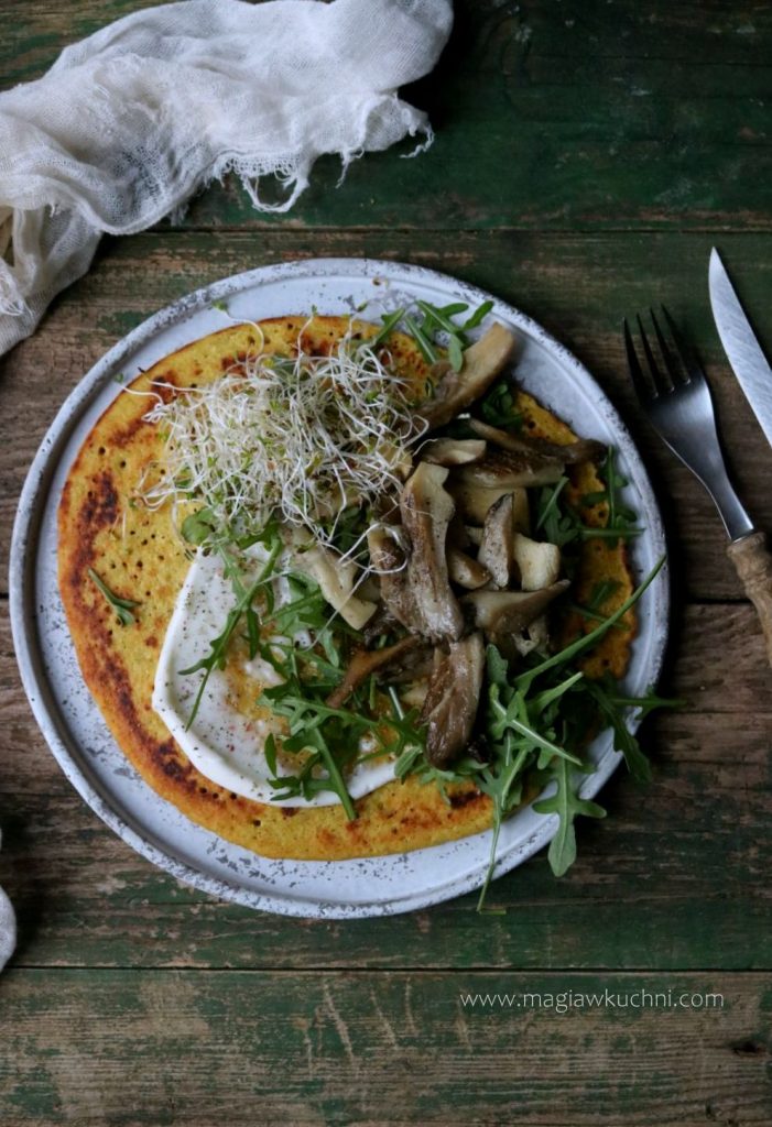 Dziś zapraszam na wegański omlet , jeśli go spróbujecie na pewno nie będziecie żałować jest aromatyczny i pyszny oraz wysokobiałkowy będzie idealnie po treningu. Podaję go z grzybami które również zawierają sporo białka 😉 a la świeżości rucola i soczyste kiełki Polecam